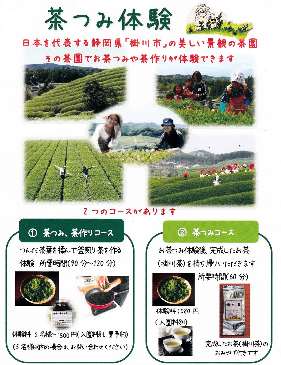 主要時間:茶つみ、茶作りコース(90〜120分)茶摘みコース(60分)
